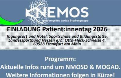 Die Neuromyelitis optica Studiengruppe (NEMOS) lädt PatientInnen mit NMOSD und MOGAD zu Information und Austausch beim NEMOS-PatientInnentag 2026 am 30.09.2026 ein.
